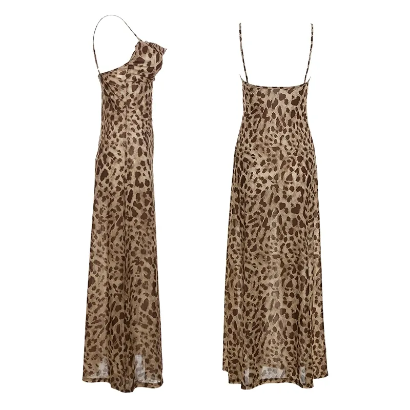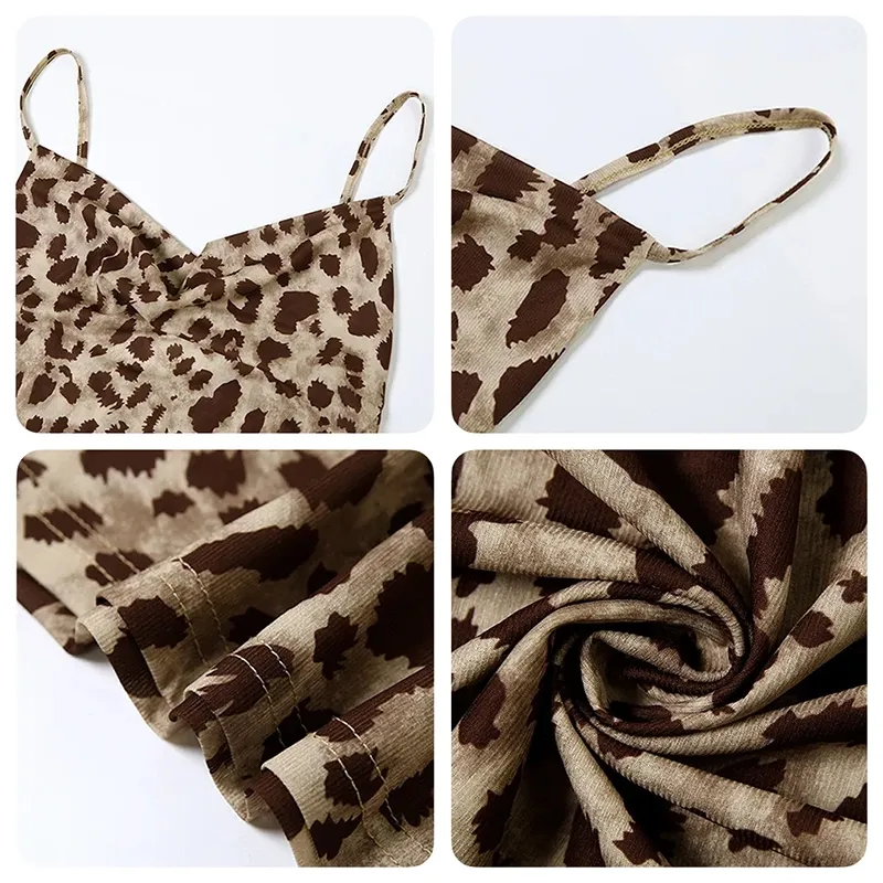 This dress features a plunging V-neckline, adding a touch of sophistication to your appearance. The backless design offers a sultry and elegant appeal, perfect for special occasions. Spaghetti straps provide a delicate and feminine silhouette, enhancing the overall look. Leopard print fabric adds a timeless and fashionable element to your wardrobe. Crafted from high-quality materials, it ensures comfort and durability throughout the evening. Pair this dress with statement heels and accessories to complete the glamorous ensemble.