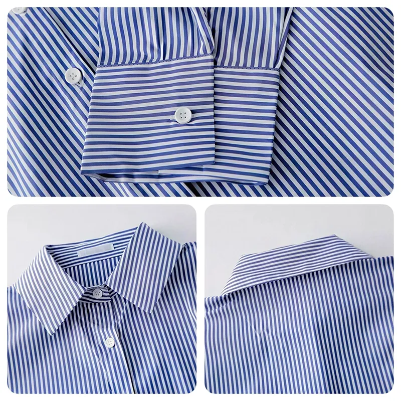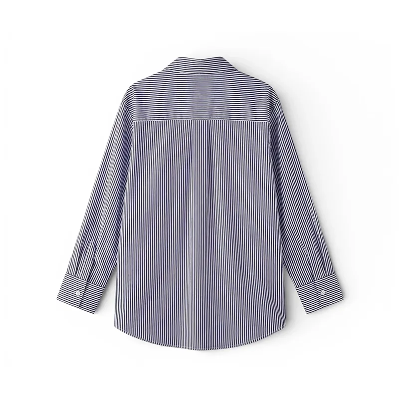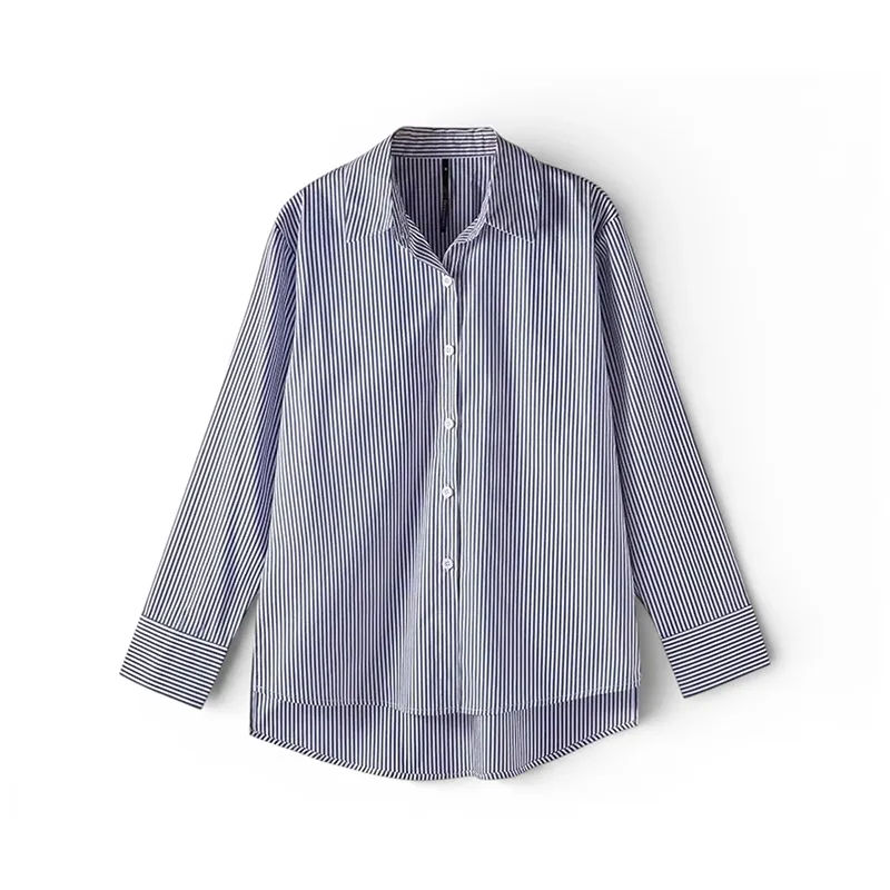 Soft, breathable material provides comfort, airflow, and ease during activities. Vertical stripes create a slimming, elongating effect, enhancing natural body lines. The design allows for layered styling with jackets, vests, or cardigans, creating a variety of looks. Long sleeves offer protection against the cold without restricting movement. This shirt is suitable for both casual and professional settings, becoming an essential addition to your wardrobe.